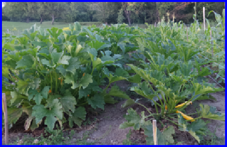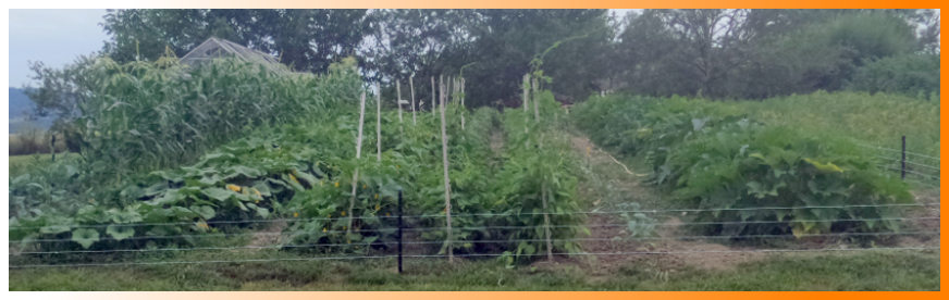 Le potager en 2017, de gauche à droite : lignes de maïs, choux romanesco, courges, cornichons, haricots, carottes, choux de Bruxelles, courgettes et pommes de terre. Il y a deux ans, nous avons été contraints d’installer une barrière électrique pour protéger les cultures contre les nombreux blaireaux qui visitent la nuit (et même parfois la journée) le potager en passant sous la clôture grillagée qui entoure le jardin.