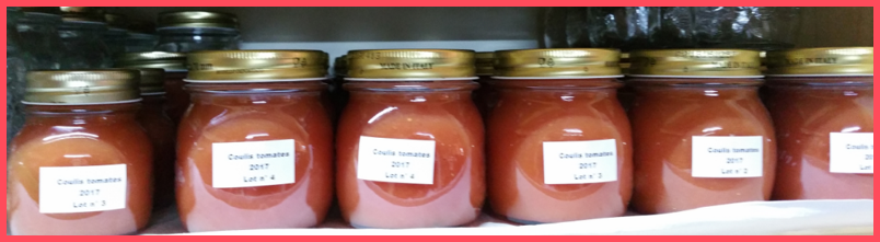 Pour les tomates que nous consommons dès les premières cueillettes fin juillet seulement, le surplus est stérilisé en coulis (environ 50 à 60 pots de 0,250).