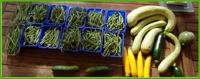 Ici la récolte d’une journée moyenne qu’il faut préparer rapidement : haricots, concombres, courgettes (jaunes, vertes, de Sicile et de Nice.