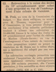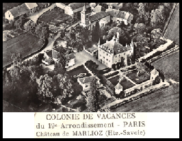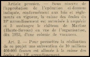 A partir de 1952 des démarches sont entreprises par le conseil municipal du 19ème arrondissement de la ville de Paris pour acquérir le château en vue de l’organisation en 1953 d’une colonie de vacances. Au cours d’une séance du conseil municipal des 29 et 30 décembre 1952, une subvention de 10'400'000 francs est allouée à la caisse des écoles du 19ème arrondissement pour l’achat du château de Marlioz en vue de l’aménagement d’une colonie de vacances.
