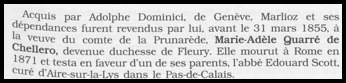 Le château aurait été acquis par M. Adolphe Dominici de Genève qui le revendra par la suite à la veuve de Monsieur le comte avant mars 1855. Malgré de longues recherches, je n’ai trouvé aucune trace de cette acquisition par M. Adolphe Dominici.