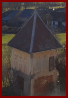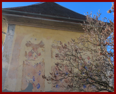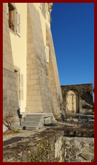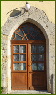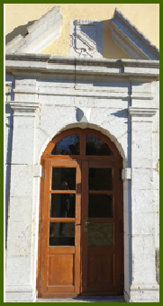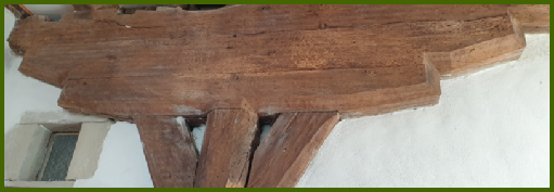Les deux portes d’entrées du château et une magnifique poutraison située dans l’entrée. Sur la porte de gauche la date de 1673 avec les armoiries de Melchior de Livron (1618-