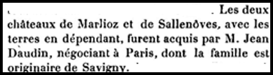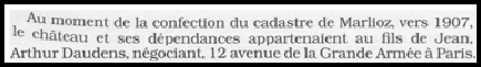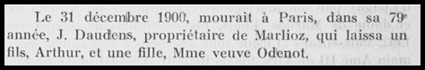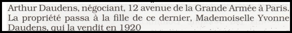 Jean Daudens meurt le 31 décembre 1900 et le château est transmis à son fils Arthur et à sa fille Yvonne Daudens, veuve Odenot.Il semble toutefois que dès 1907, le château soit la propriété d’Arthur Daudens (texte extrait des pages 41 et 42 de l’ouvrage Echos Saléviens de janvier 1995 Gallica-