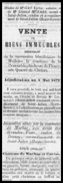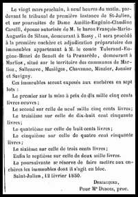 Le château est mis aux enchères le 20 mars 1850 pour la somme de 10'500 livres neuves.