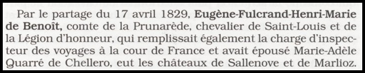 En fonction de ces nouveaux éléments et de la documentation photographique qu’il m’a été permis d’utiliser, je complète ainsi mes recherches à partir du 17 avril 1829 date à laquelle le comte Eugène Fulcrand de la Prunarède (1784-