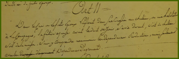 Dans le cas où le futur époux hériterait dans sa succession un château ou une habitation à la campagne, la future épouse aurait le droit de jouir et sa vie durant soit du château soit de la maison sans y comprendre néanmoins les dépendances productives mais seulement avec les dépendances d’agrément