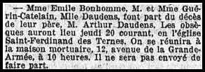 Avis de décès paru le 20 août 1925 dans le journal l’Intransigeant