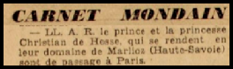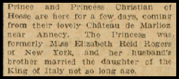 Dans la presse américaine The Chicago Tribune apparaît le 18 août 1928 une information précisant que le prince et la princesse Christian de Hesse se trouvent à New York pour quelques jours arrivant de leur charmant château de Marlioz près d’Annecy. En juillet 1934 le prince Christian de Hesse et son épouse la princesse Elisabeth Rogers vont séjourner dans le château.