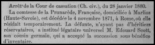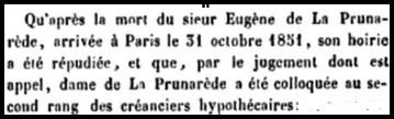 Monsieur le comte de la Prunarède meurt à Paris le 31 octobre 1851 et son hoirie est répudiée.
