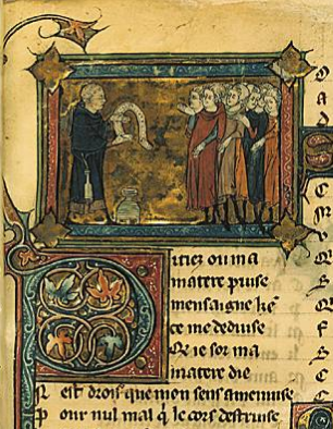 Miniature datant du XIIIème siècle extraite d’un recueil de poésies de Jehan Bodel et qui le représente (homme tenant un texte dans ses mains). Miniature de la Bibilothèque nationale de France (source Wikipédia.org)