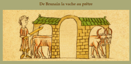 Le vilain quitte le prêtre qui commande aussitôt qu’on fasse, pour l’apprivoiser, lier Blérain avec Brunain, sa propre vache. Le curé les mène en son jardin, trouve sa vache, puis les attache l’une à l’autre. La vache du prêtre se baisse, car elle voulait paître. Mais Blérain ne le veut pas, et tire la corde si fort qu’elle entraîne l’autre dehors, et la mène à travers maisons, champs et prés si bien qu’elle revient enfin chez elle, avec la vache du curé qu’elle avait bien de la peine à tirer. Le vilain regarde, la voit, et en a grande joie au cœur.