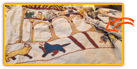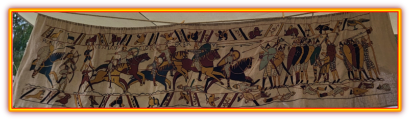 Pour mémoire cette œuvre textile décrit des faits allant de la fin de règne du roi d’Angleterre, Edouard le Confesseur, en 1064 à la bataille d’Hastings en 1066, dont l’enjeu était le trône d’Angleterre (source Wikipédia). En effet, Guillaume le Conquérant, duc de Normandie, est devenu roi d’Angleterre après sa victoire à la bataille d’Hastings (Sussex de l’est).