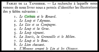 Michèle m’apprend aussi que certaines scènes d’animaux représentées sur les parties inférieures de l’œuvre textile ont été reprises notamment par Jean de la Fontaine. Après quelques recherches un ouvrage écrit en 1934 me permet de mieux comprendre l’origine de l’inspiration de certaines fables.