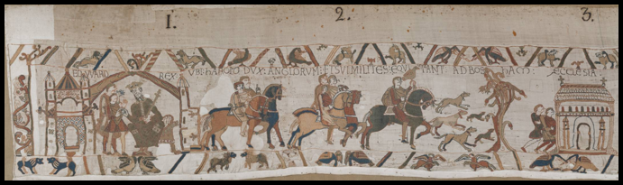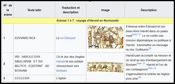 Cette reproduction de 2024 représente les scènes 1-2-3 de la tapisserie de Bayeux. Voici les explications de ces 3 scènes (selon un document source Wikipédia).