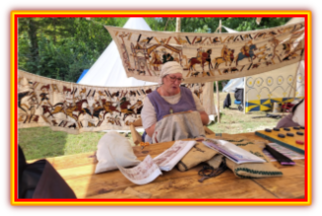 Je m’arrête à nouveau sur le stand qui expose des panneaux représentant des scènes de la tapisserie de Bayeux. L’an passé j’avais été émerveillée par la reproduction ci-dessous photographiée le 27 août 2023.