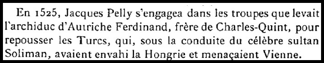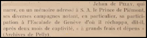 En 1602, Jehan (Jean) de Pelly prétendra avoir participé à l’Escalade de Genève (attaque lancée dans la nuit du 11 au 12 décembre 1602 par les troupes du duc de Savoie, Charles-