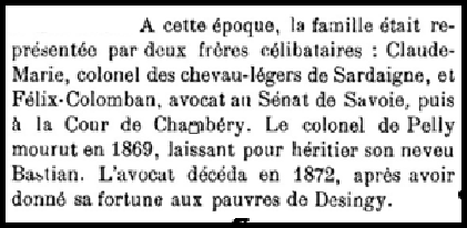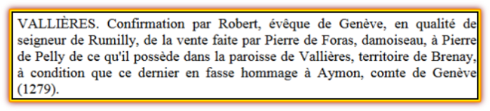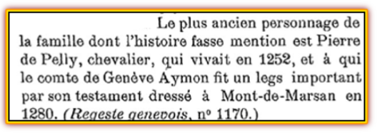 Il semblerait qu’en 1252 un chevalier qui s’appelait Pierre de Pelly reçut, par un testament établi le 18 novembre 1280, un leg important du comte de Genève Aymon II.