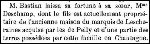 A la mort d’Edouard Claude Bastian en 1889, à l’âge de 31 ans, le château sera légué à sa sœur, Françoise dite Fanny (1860-