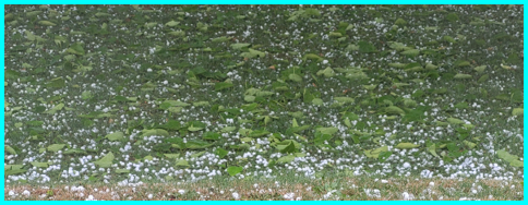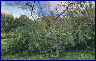 Et nous voici arrivés à la journée fatidique du lundi 24 juillet. Il est 15h20 et soudain un orage de grêle s’abat sur le village. Je vois les fruits de mes arbres tomber, les branches cassées et les feuilles hachées jonchent le sol. Je suis découragée.