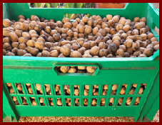 Le lendemain par une belle journée ensoleillée je me suis installée sur la terrasse pour débuter le « gremaillage » des noix récoltées en belle quantité en octobre 2022 (2 grands bacs verts pleins).