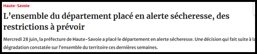 Dès le 28 juin 2023 le département de la Haute-Savoie est placé en grande partie en alerte sécheresse (document source le Dauphiné Libéré).