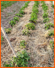 Les plants de pommes de terre plantés les 2 et 3 mai 2023 (jours racines) grandissent rapidement. Je vais devoir pailler les allées car la mauvaise herbe se répand inexorablement.