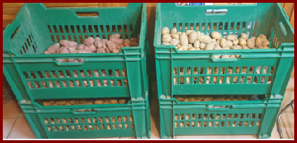 Il est content du résultat et du peu de dégât constaté sur les pommes de terre (juste une petite caisse que je vais cuisiner très vite). Nous allons manger de la purée et du gratin ces prochains jours. Pour finir je récupère 75 kg de Chérie et de Charlotte sans compter les Rosabelles que nous consommons depuis le mois de juin. C’est pour moi une belle récolte qui nous suffira jusqu’au mois de mai 2024.