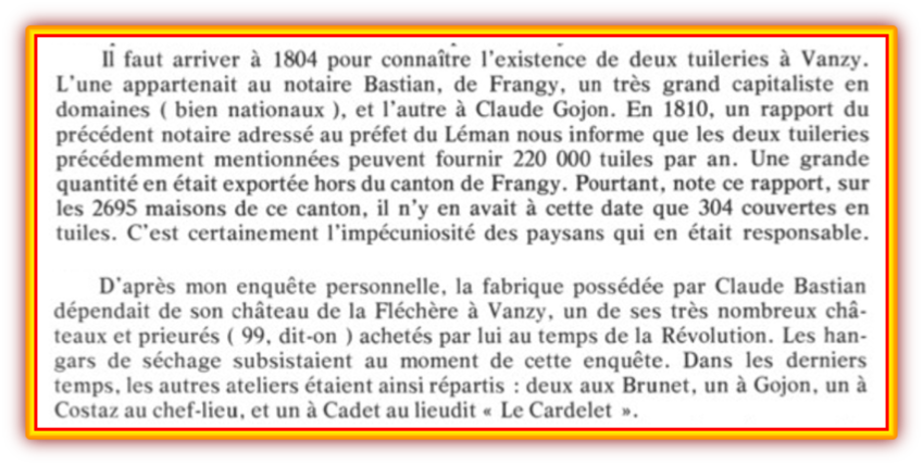 Le château de la Fléchère à Vanzy sera acquis par Claude François Bastian. Cette famille Bastian a joué un rôle politique local important, notamment à Frangy. Claude François Bastian est notaire à Frangy depuis 1784 et il sera nommé régisseur des domaines nationaux du bureau de Frangy. Avec Hélène Chaumontet, son épouse, ils auront 5 enfants dont Claude-