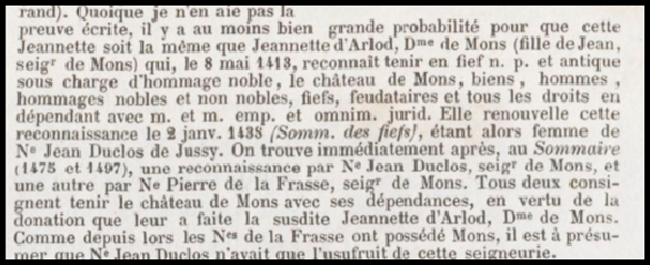 Jeannette d’Arlod, veuve, épousera en 1436 Noble et Puissant Girard d’Arlod, chevalier et seigneur de Mons.