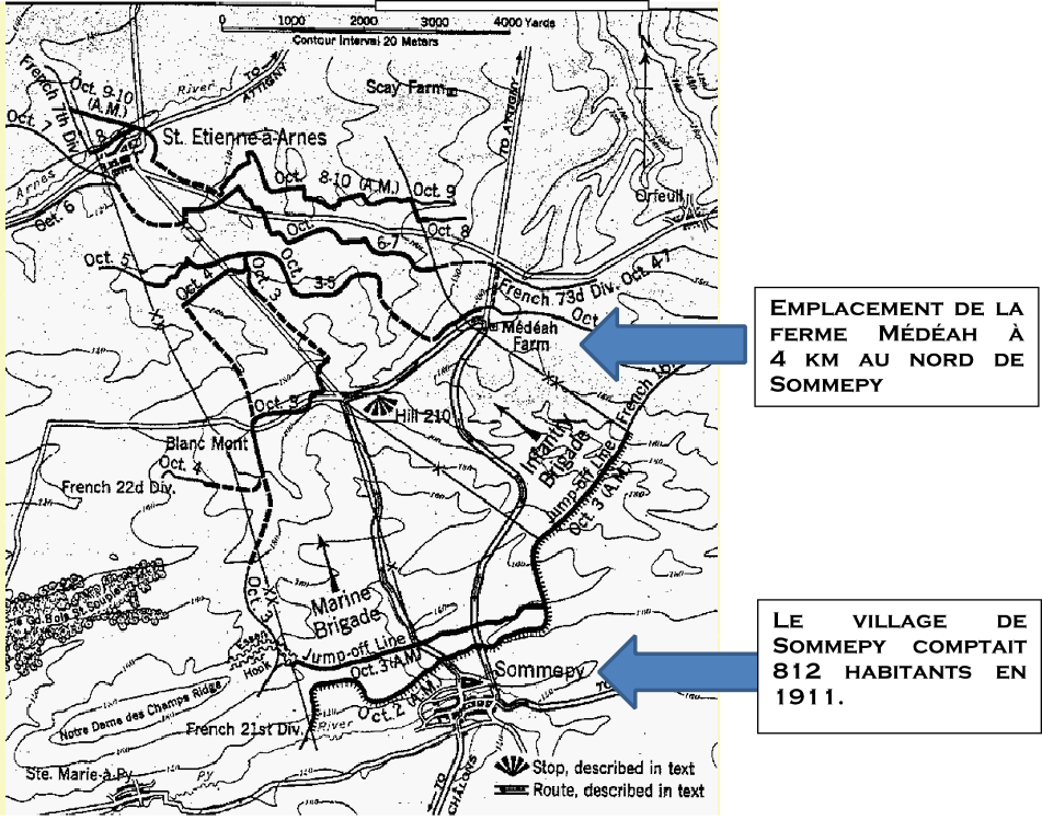 C’est au cours d’une offensive, le 3 octobre 1918, que le 346ème Régiment d’Infanterie est lancé vers la ferme de Médéah au nord de Sommepy empoisonnée par les gaz et sous les feux des mitrailleuses ennemies.