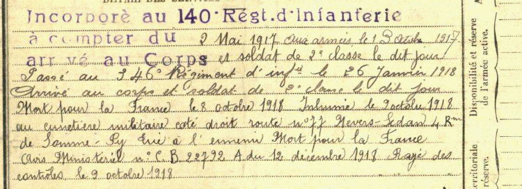 Il est incorporé au 140ème Régiment d’Infanterie dès le 2 mai 1917. Il passe au 346ème Régiment d’Infanterie le 26 janvier 1918.