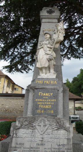 Le village de Frangy comptait 1179 habitants lors du dernier recensement du 31 mars 1911. 47 soldats sont morts sur les champs de batailles. Le monument se trouve sur la place centrale, à proximité de l’église.