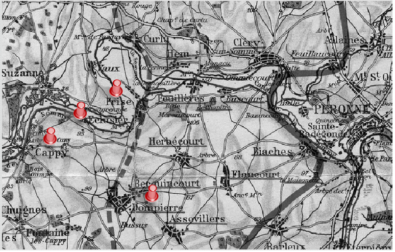 Le secteur du champ de bataille est jalonné, en première ligne, par le village de FRISE (1) et la sucrerie de DOMPIERRE (2) et à l’arrière par ECLUSIER (3) et CAPPY (4).