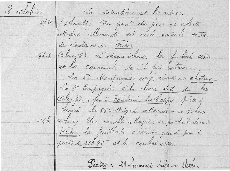 Extrait du journal des marches et opérations du 30ème RI du 2 octobre 1914 (source Ministère de la Défense)