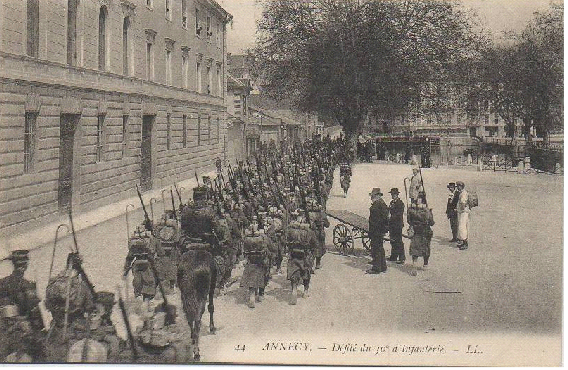 Il est mobilisé dès le 2 août 1914 et le 5 août au soir, le régiment est embarqué pour la région d’Epinal. Ce régiment a notamment pour mission d’occuper les cols des Vosges. Dès le 20 août, le régiment est contraint de battre en retraite et le 28 août il est rejeté dans la vallée de la Meurthe. En septembre, il passe dans la vallée de la Mortagne (Vosges). Les pertes sont très importantes et plus de 3000 soldats sont partis d’Annecy en renfort.