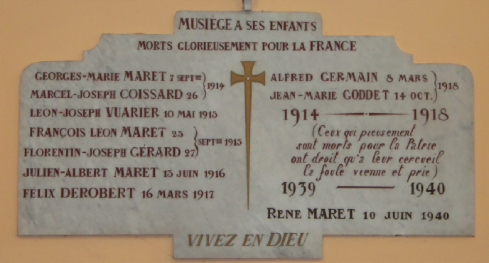 Le village de Musièges comptait 212 habitants lors du dernier recensement du 1er avril 1911. 9 soldats sont morts sur les champs de batailles. Il n’y a pas de monument aux morts pour cette commune. Une plaque commémorative est installée à l’intérieur de l’église.